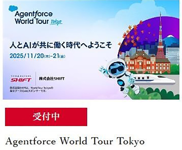 Salesforceのイベント「Agentforce World Tour Tokyo」にSHIFTがブースを出展します! 担当者へ直接ご相談も可能ですので、ぜひお気軽にお立ち寄りください。